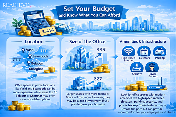 Setting a clear budget is essential before you start looking for office spaces. The prices for commercial office spaces in Navi Mumbai can vary based on location, amenities, size, and type of building. Here are some factors to consider while budgeting: